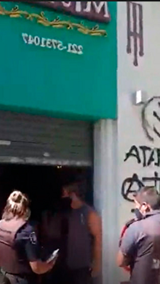 Ataque y vandalismo en el meeting partidario de Renacer: Policía viendo el estado del local vandalizado por el grupo Anti Fa / La Plata 24/03/2021