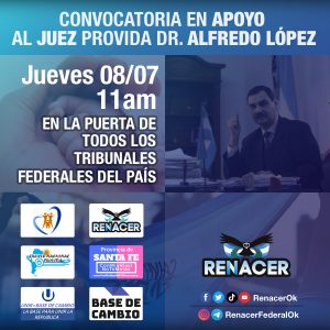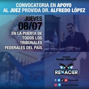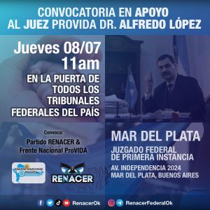 El partido Renacer, junto a otros partidos políticos denominados «celestes» y organizaciones Pro Vida, adhiere a la medida tomada por el Juez, e invita a la ciudadanía a brindar su apoyo al Juez en las puertas de los juzgados federales de las principales ciudades de la Nación, el próximo Jueves 8 de Julio a las 11 de la mañana.