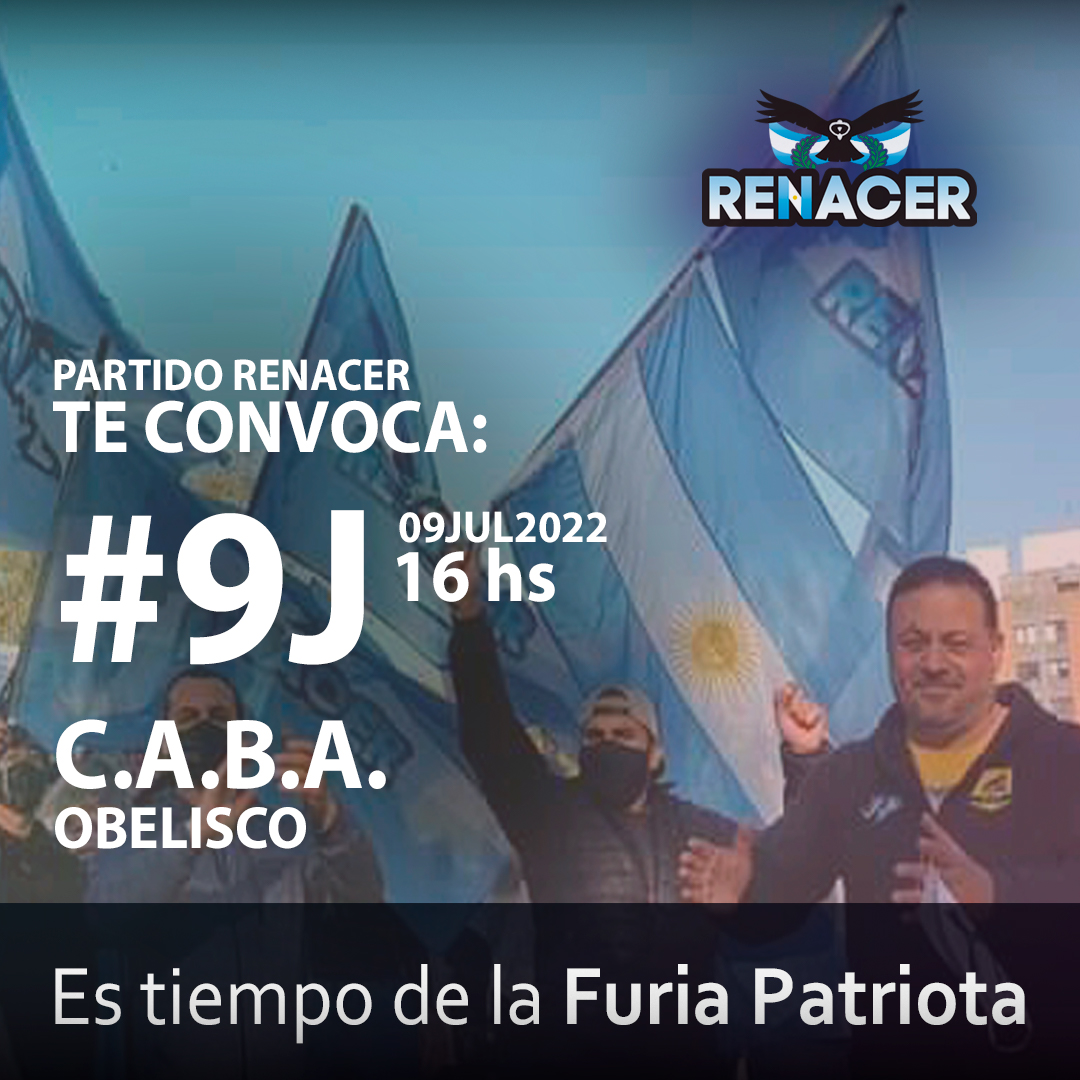 Convocatoria del Partido Renacer a la manifestación del Sábado 9 de Julio de 2022 #9J en las plazas públicas de Buenos Aires. Flyer 1080 x 1080 px